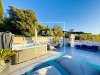 TROIS MAGNIFIQUES ESPACES EXTERIEURS / VUE DOMINANTE ET COUCHER DE SOLEIL / CONSTRUCTION CONTEMPORAINE / LUXUEUX DOMAINE SECURISE / VERITABLE JACUZZI / FAIBLES CHARGES.